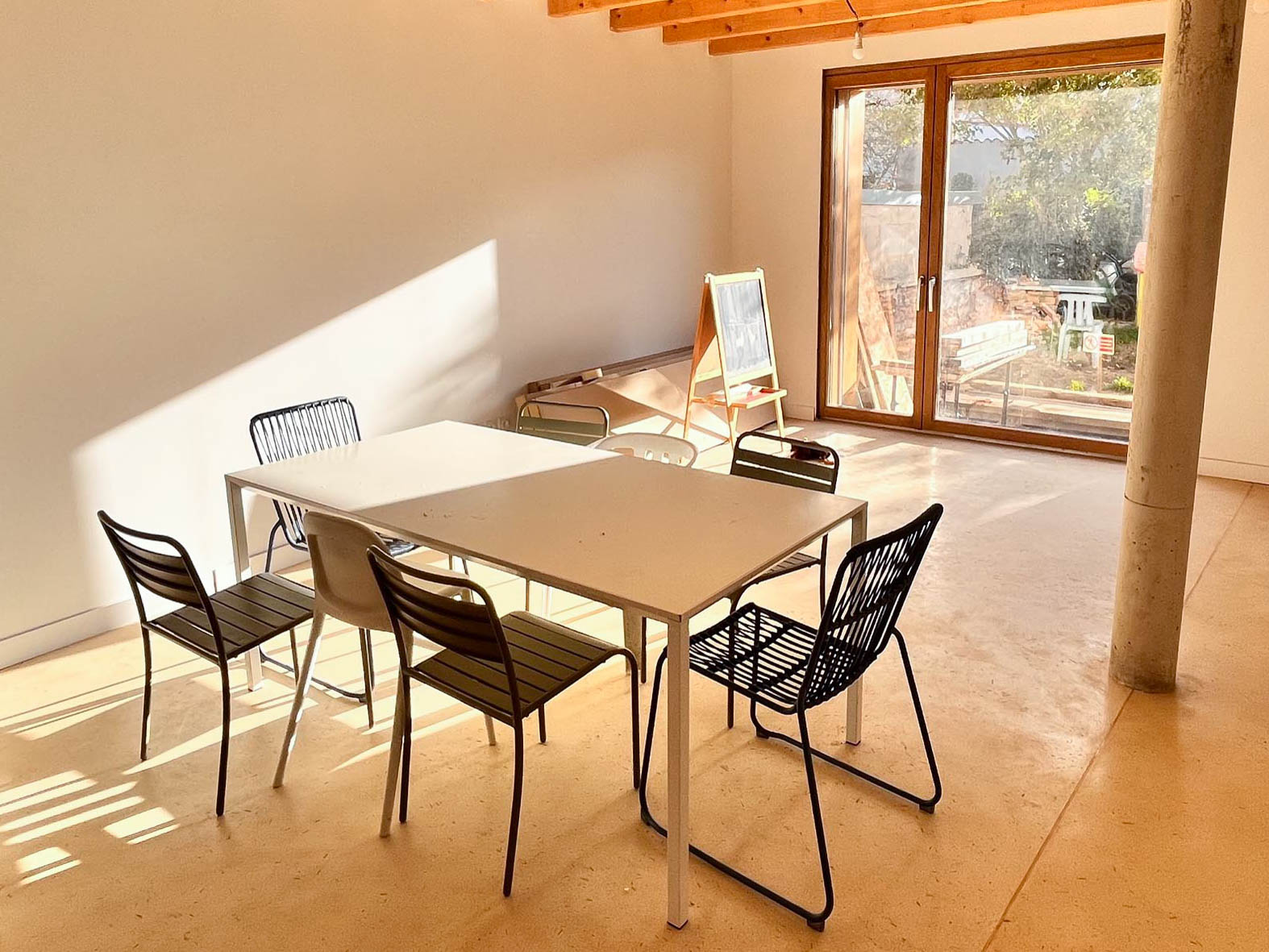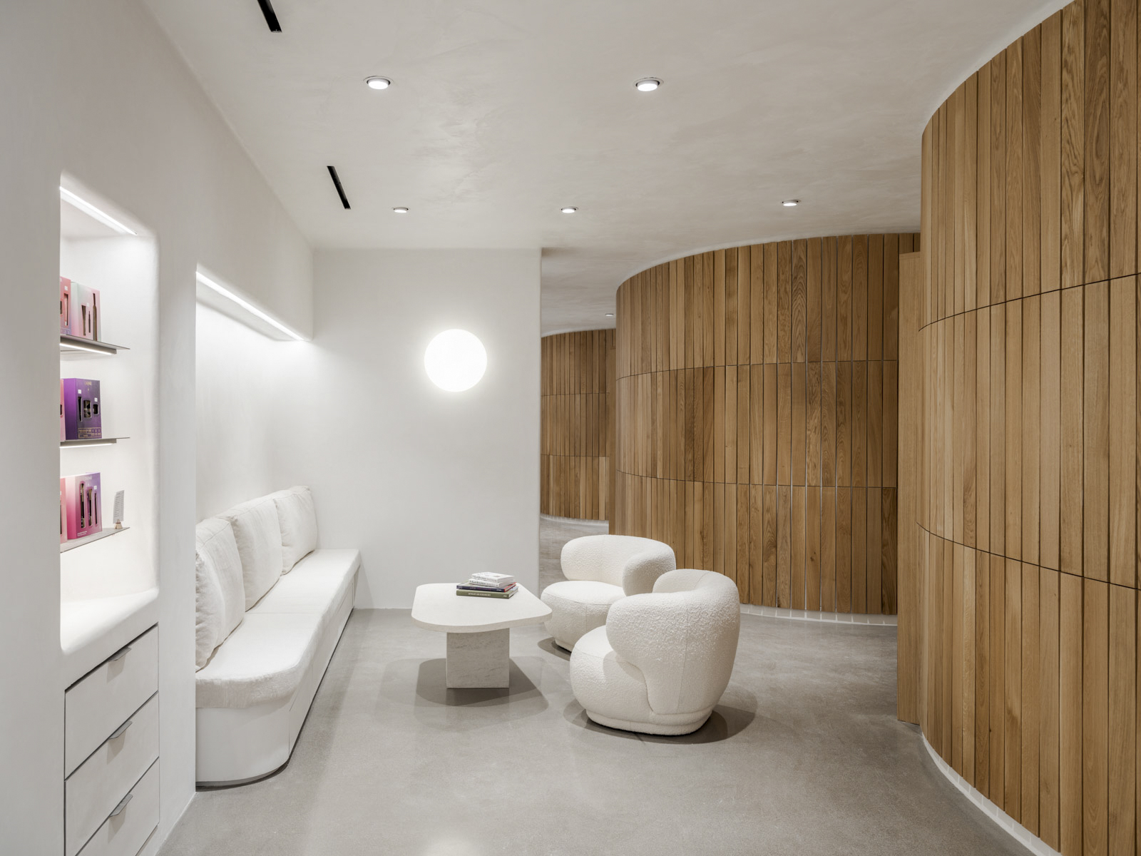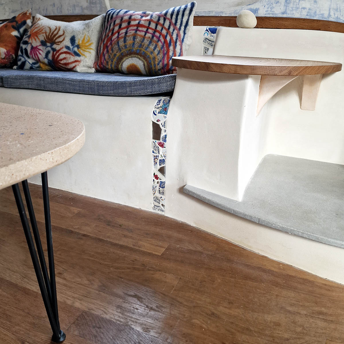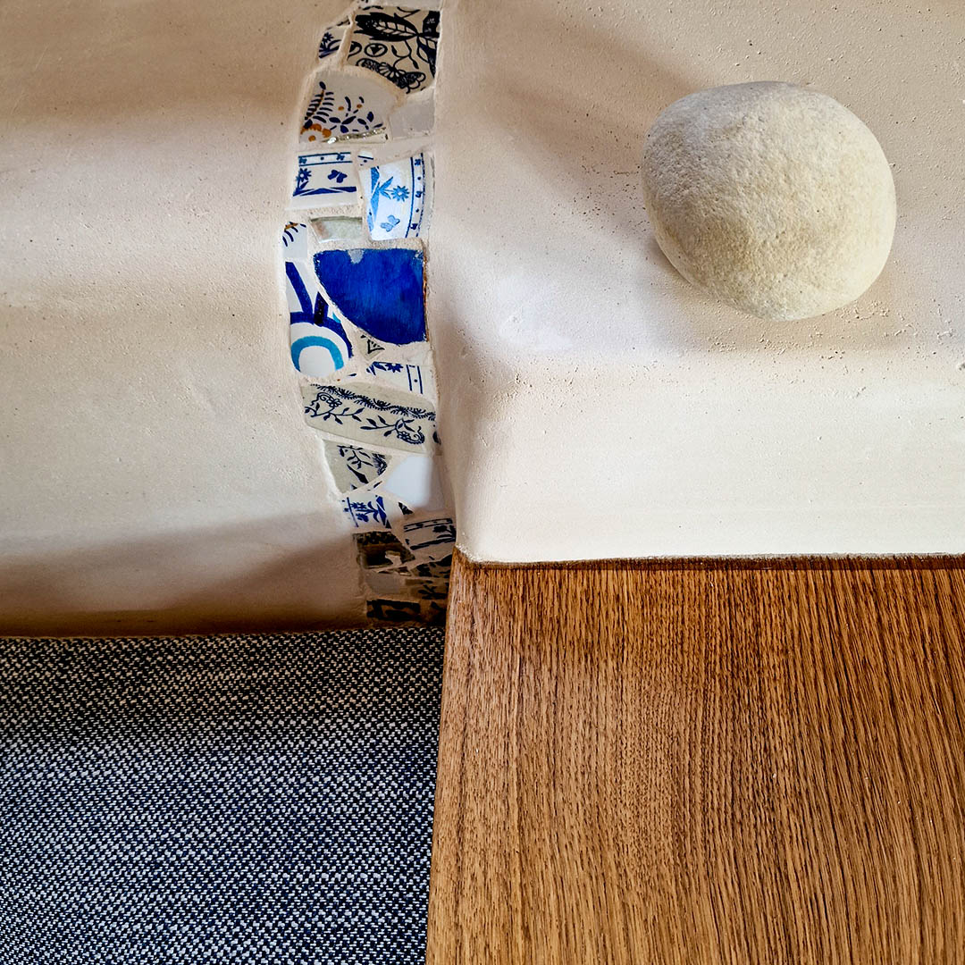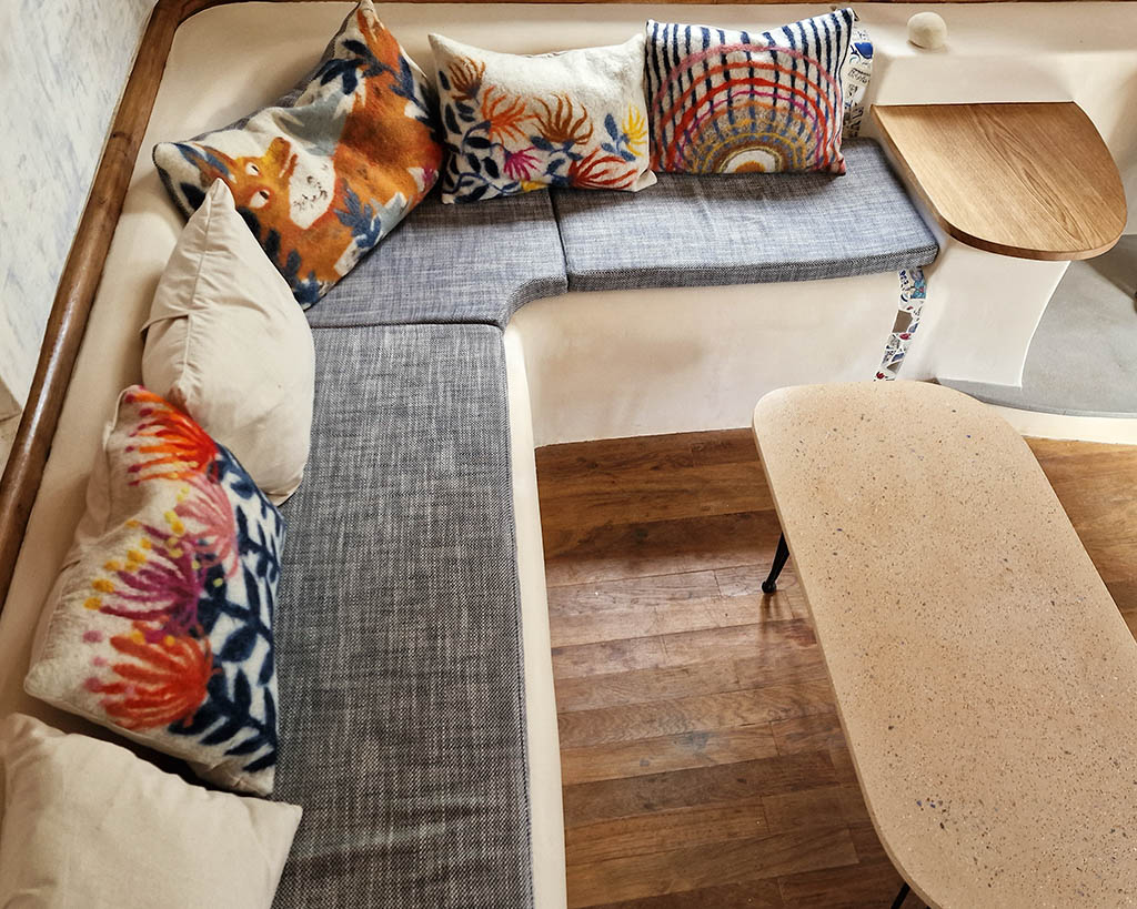 Ameublement plâtre, bois et feutre pour un intérieur organique et coloré.