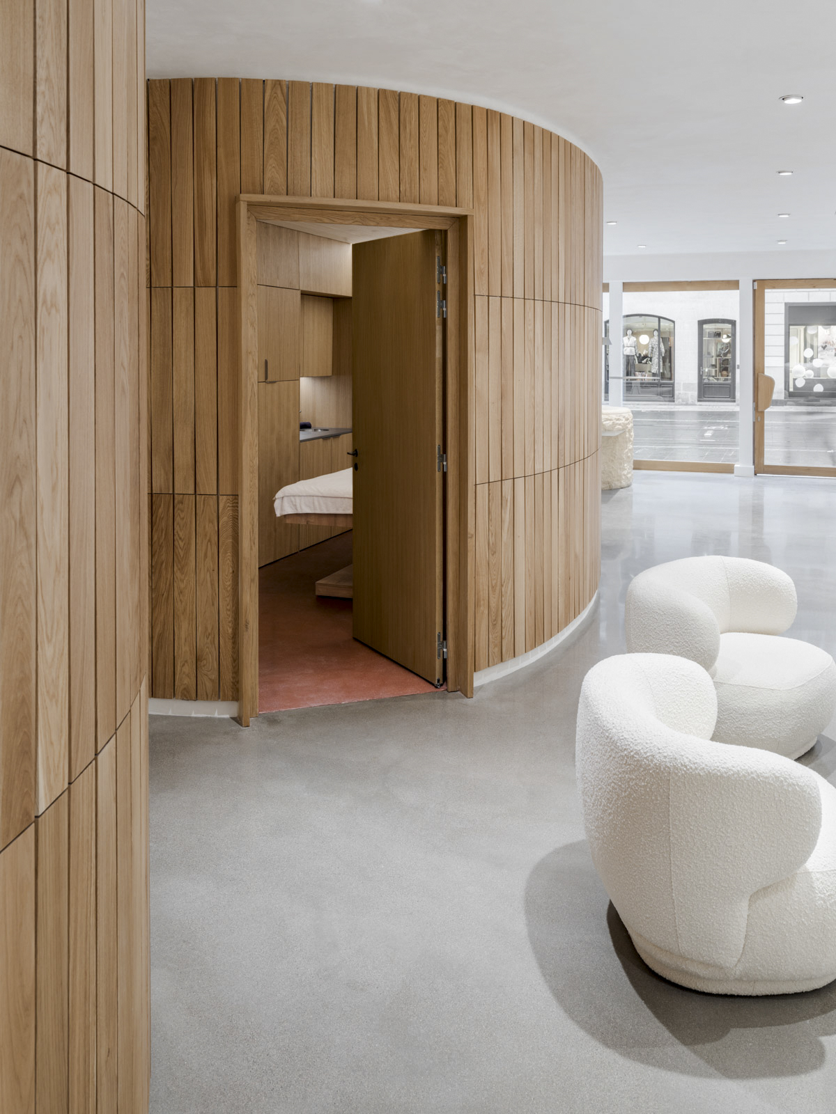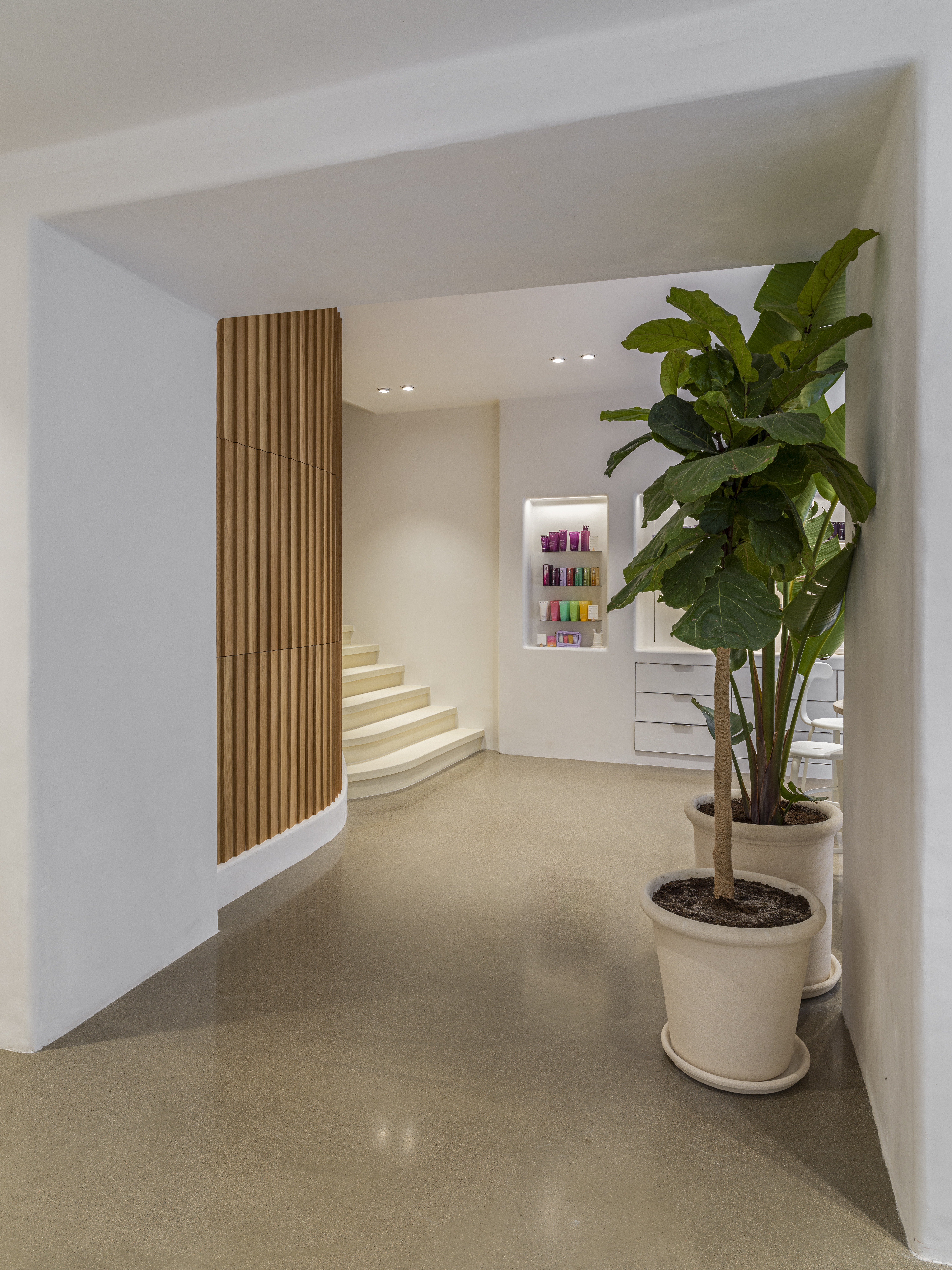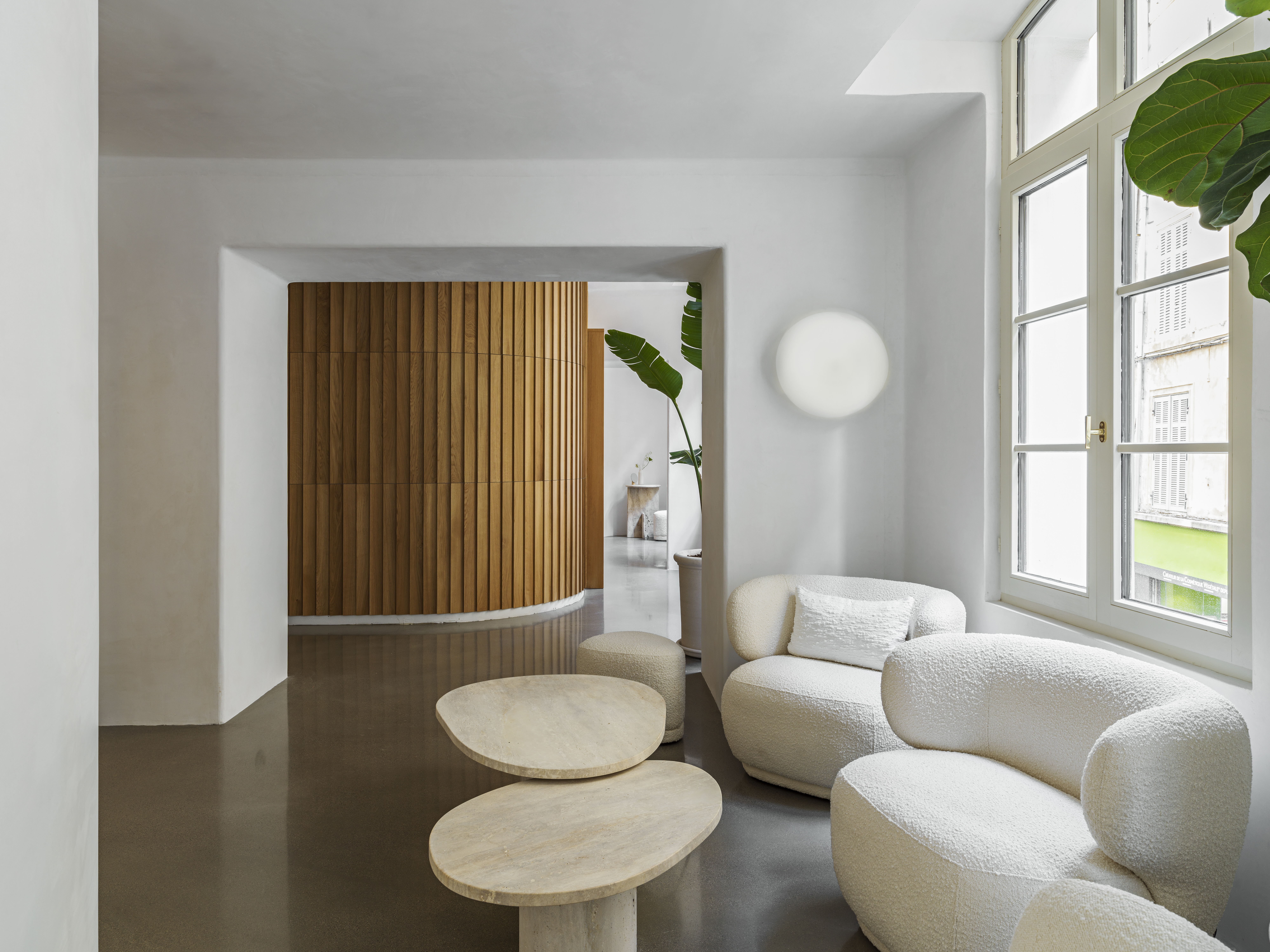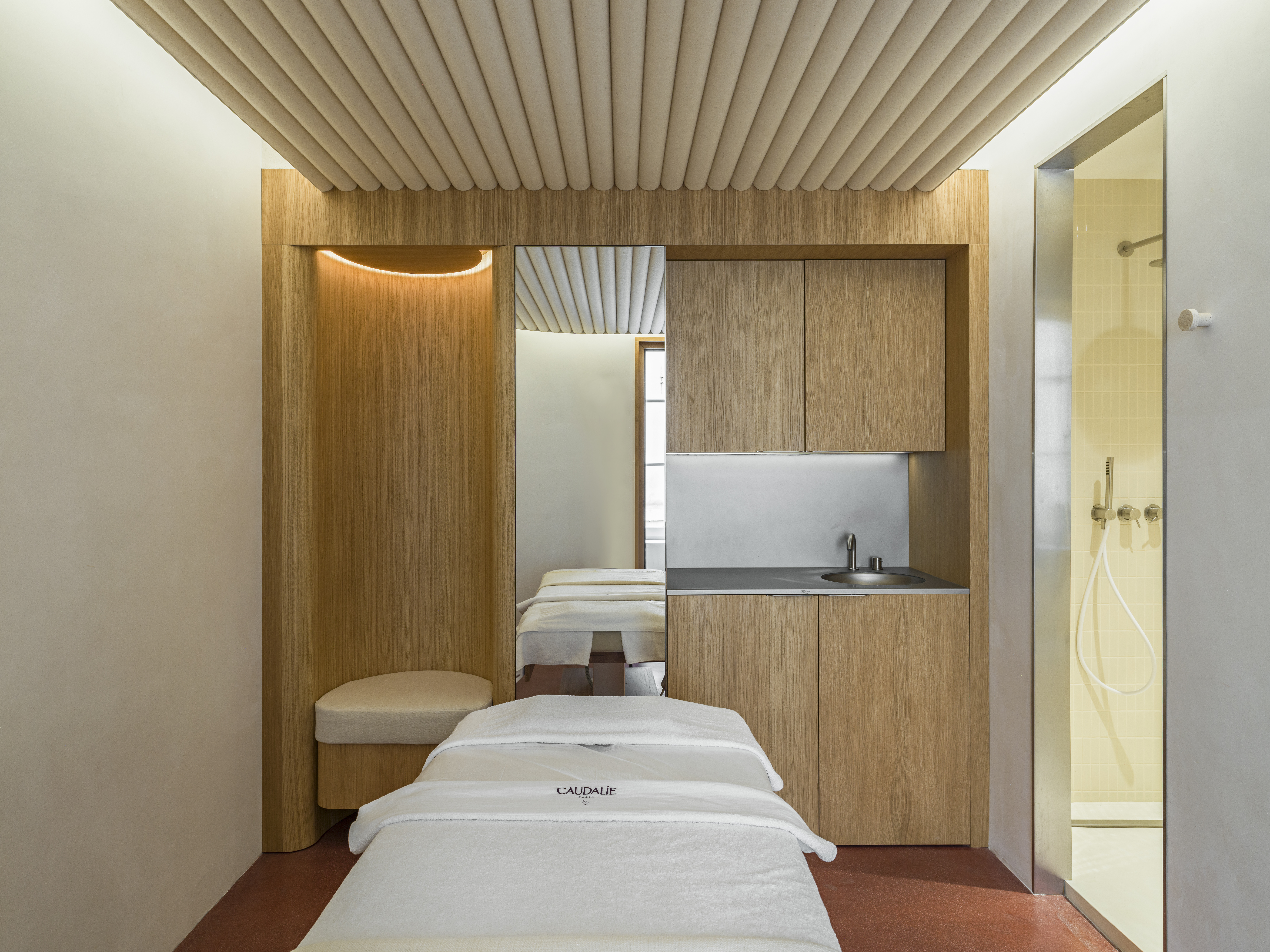 Stucs muraux à la chaux et sols plâtre à plancher dans les cabines de massage pour le nouveau Spa de Caudalie.