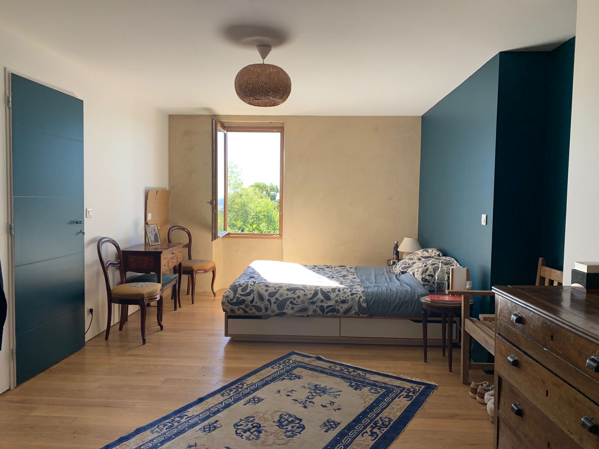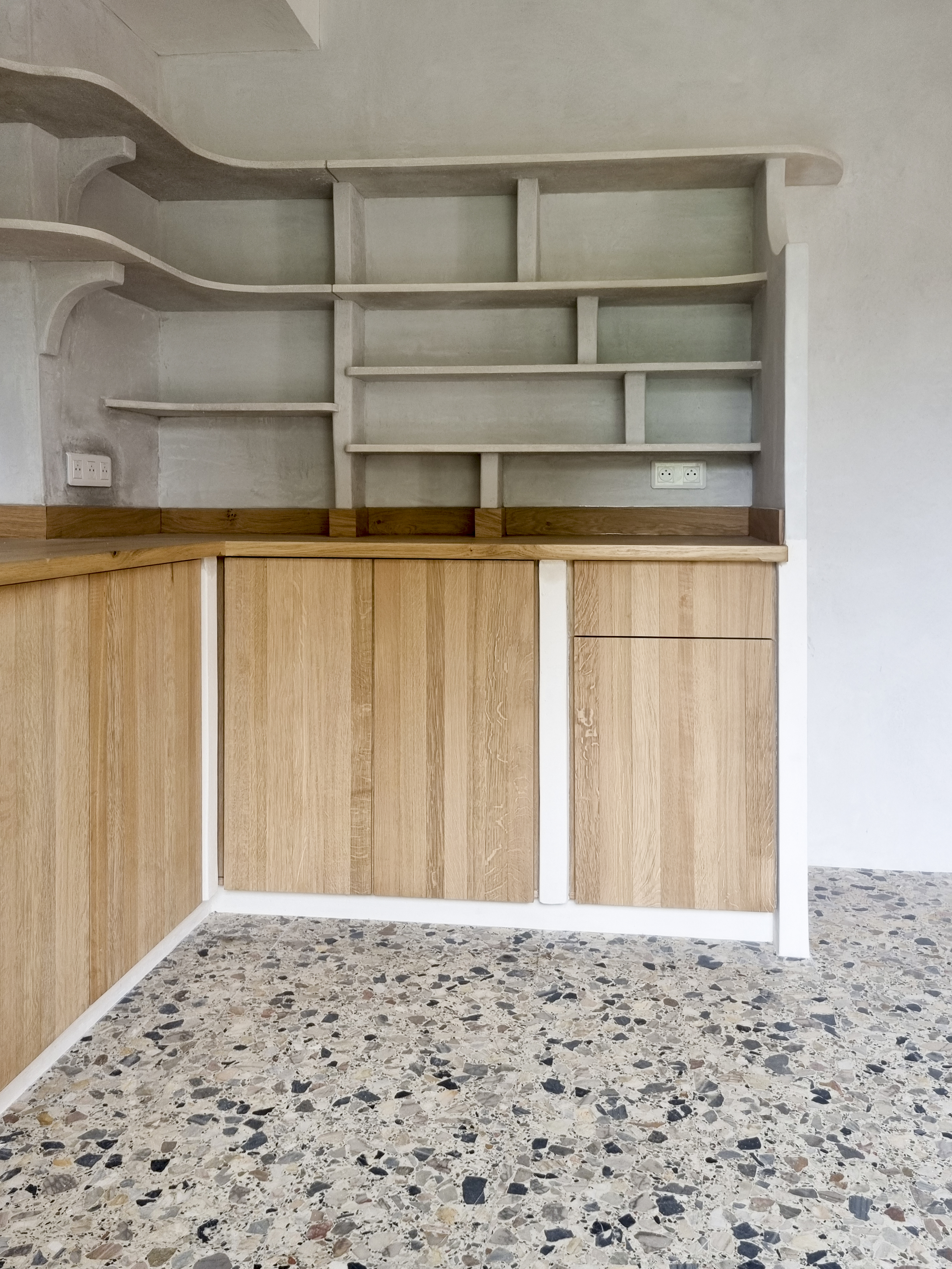Conception et réalisation d’une cuisine sur-mesure en chêne et en plâtre à plancher moulé à l’atelier. Enduits plâtre et chaux.
