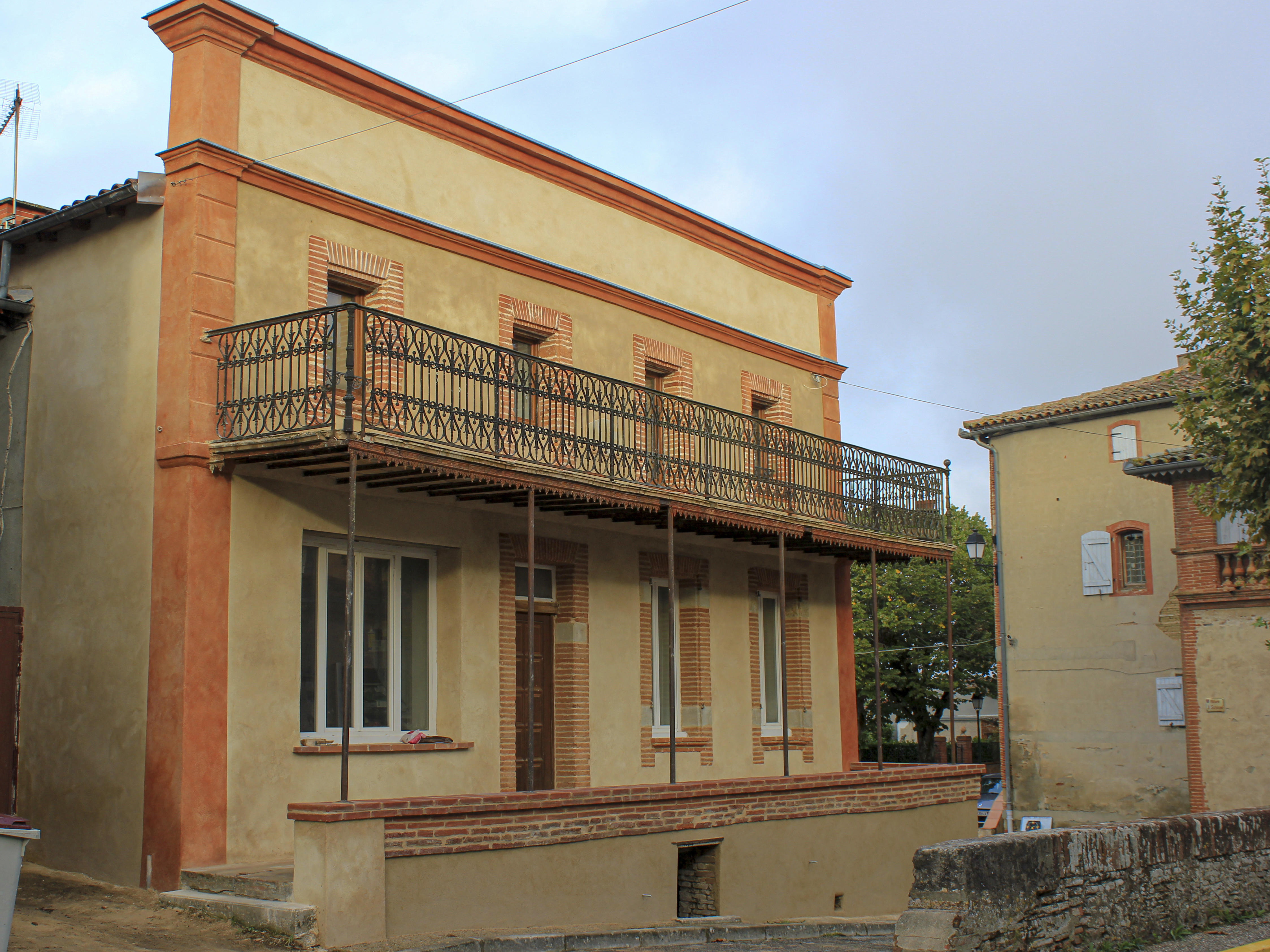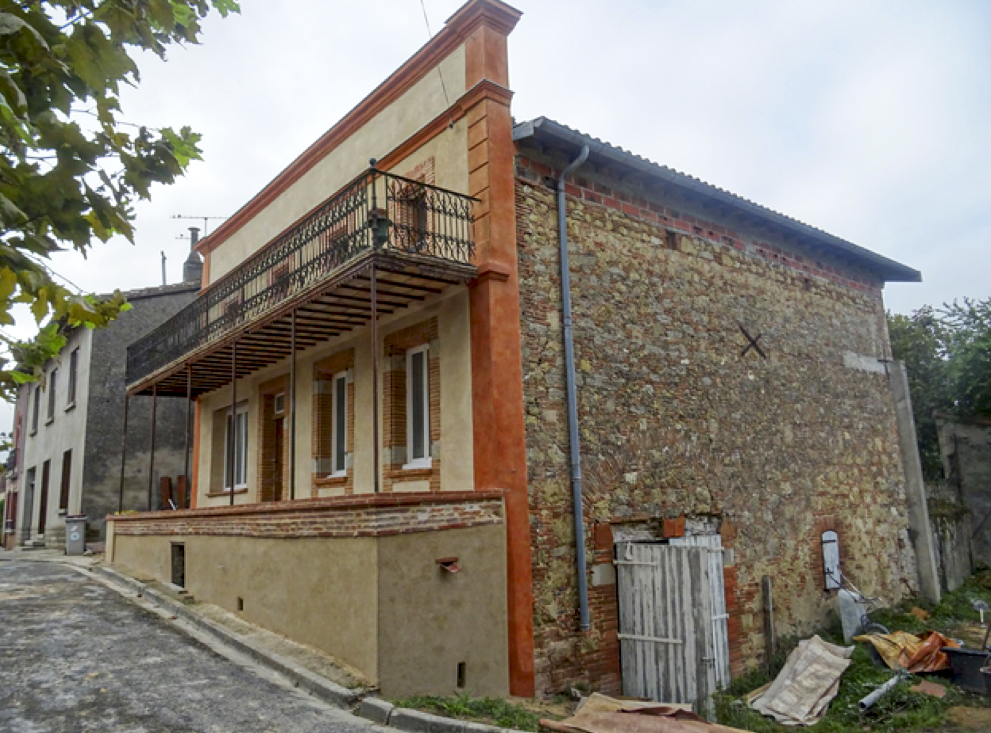 Rénovation d’une façade en brique foraine. Enduit à la chaux avec coloration a fresco des modénatures et traînage sur place des corniches.